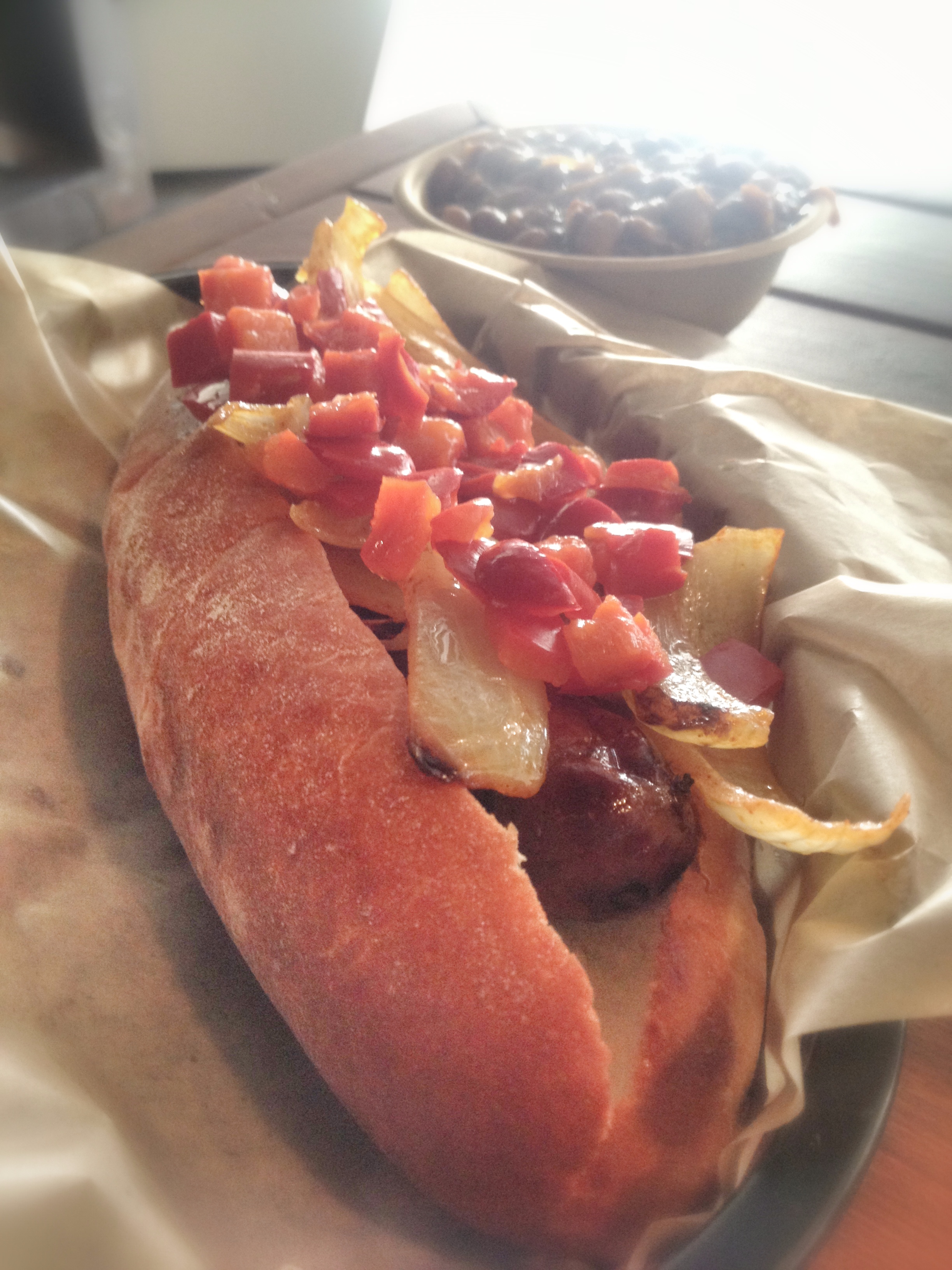 Remember when Rosamunde Sausage Grill opened in Old Oakland a few weeks ago? I stopped by the other day and tried a Grilled Sausage on a French Roll ($6-6.50). There were 15 different sausages to choose from, including a few vegan options, but I went with the Beer Sausage (smoked, spicy pork & beef). It came with two free toppings and the cashier suggested Grilled Onions and Sweet Peppers. After adding Honey Wasabi Mustard, it was spicy, smoky, sweet and deliciously messy. The tangy German Baked Beans ($3.25) rounded out the meal – and they’re vegan too, in case anyone’s interested. With around 15 beers on tap, beer drinkers are covered, too.
