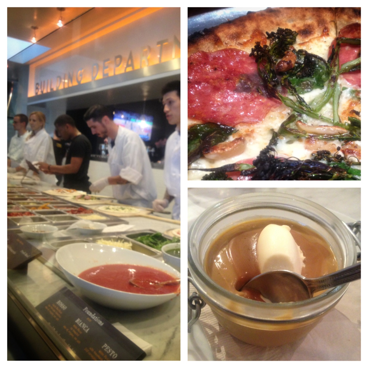 Build Pizzeria Roma opened a couple weeks ago and I was invited to check it out. It’s a create-your-own pizza concept from owners Lisa Holt and David Shapiro. First, my friend and I went through the “Building Station,” an assembly line where we decided the toppings for our individual pizzas. I went with a Pizza Bianca ($7.95) with Sopressata Piccante, Broccolini and Roasted Garlic ($1 each). My friend ordered a Pizza Rosso ($7.95) with tomato sauce, chicken, pancetta and olives. Chef Brian Langevin’s team baked it in the 900 degree wood oven for just a couple minutes and then it was delivered piping hot to our table. Without sauce, my pizza was crispy and his was almost juicy with the tart tomato sauce. We were both happy! Scott Beattie was the consultant for the bar program, but I didn’t know that when I went to the bar side of the restaurant after dinner. I was planning to just have a dessert but when I laid eyes on the huge, clear hand cut ice cube ($1.50), I had to order a Cardamon Old Fashioned (bourbon, orange, bitters, cardamon, $9). The ice cube melted slowly and they say it can be reused 2-3 times to keep the drink cold. I’ll have to test it out next time. Anyway, the Crostata Di Frutta ($8), a seasonal fruit tart with mascarpone and balsamic caramel, was flaky, barely sweet and perfectly balanced. Chef Clara Yun (The Dorchester in London and Aqua in San Francisco) knows what she’s doing. But when the bartenders kept mentioning the Budino (housemade butterscotch pudding, sea salt, mascarpone, $8), I ended up trying that too. Honestly, I planned on just taking a couple bites, but it was so creamy and downright addictive, I finished the entire thing. Oh well. Sometimes you need more than one dessert, right?