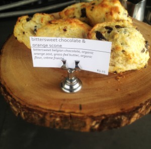 After Remedy Coffee closed unexpectedly last summer, I’ve been waiting to see what would open in its place.  Well, according to Facebook, Barkada Bakery, which has been popping-up with baked goods and coffee on the sidewalk during construction, officially opened on Saturday.  Barkada means “group of friends” in Tagalog, which is the native language of pastry chef-owner Christina Bondoc.  Virtually everything will be made in house using organic ingredients – grass fed butter, whole grain wheat from Guisto’s, etc.  Some items on the menu include croissants, morning buns, sandwiches, salads, cakes and coffee.  Speaking of coffee, co-owner Rich Yarussi is a “certified coffee geek”  and proudly serves West Oakland’s Scarlet City.  I stopped by a pop-up about a month ago for a Bittersweet Chocolate & Orange scone ($3.25).  Construction is finally over and the bakery is currently open for limited hours, with plans to expand in the next week or so.