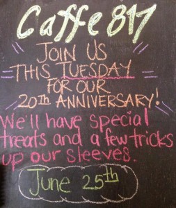 Sandro Rossi opened Caffe 817 on June 25, 1993 and it quickly developed a loyal following with many of those first customers still visiting today. Chefs Scott and Emily Goldenberg took over in March of 2011 and “were thrilled to be able to jump into the community of this restaurant which we ourselves had come to love over the years.” There are a few lunch specials today and since it’s raining, the Chickpea and Tomato Soup with Arugula ($6.75) sounds perfect. To thank new and old customers and to celebrate the 20th Anniversary, the entire food menu will be 10% off all day. And, there will be more surprises…