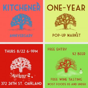 It seems like yesterday when Kitchener first opened, but it’s almost time to celebrate their first birthday with what they’re known for: “a delicious and vibrant pop-up market, featuring some of the freshest talents in Oakland’s foodmaker scene.” Participating artisans include Barbarian Gourmet (vegan Mushroom pot pies and vegetable tian), Bump City Bakery (St. Germain cupcakes and saucy strawberry mini pies), Common Fare Foods (Texas Squealers (1/2 beef, 1/2 bacon) and Santorini Sliders (fig-glazed lamb burgers), Javi’s Cooking (Argentine empanadas and alfajores), Ruby Red Kitchen (Fresh corn tamales with roasted poblanos & goat cheese), Tart! Bakery (Chocolate mousse, flourless chocolate cake, and seasonal pie slices), Uptown Juice Company (Colorful cold-pressed juices) and Wooden Spoons (Duck, pork, or salmon rillettes on crostini). Most dishes will be $5 and under and beer will only cost $2. I’ll have a table (and some surprises) next to David Teixeira of Lusu Cellars, who will offer free wine tasting.