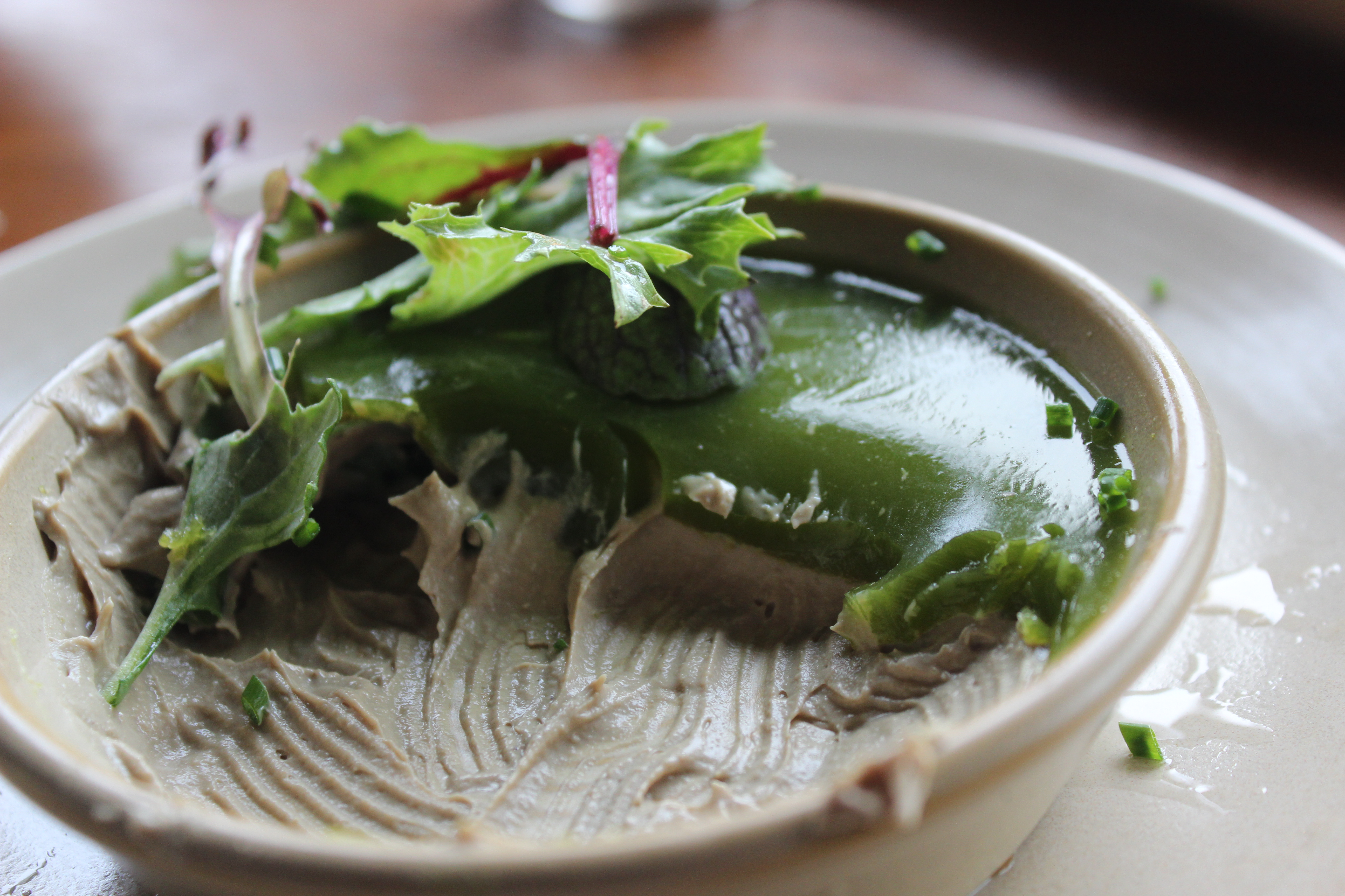 The Chicken Liver Mousse (with Parsley Gelee and Crostini, $8) was probably the most interesting dish on the menu.  This is what is looked like when the server first brought it to our table…