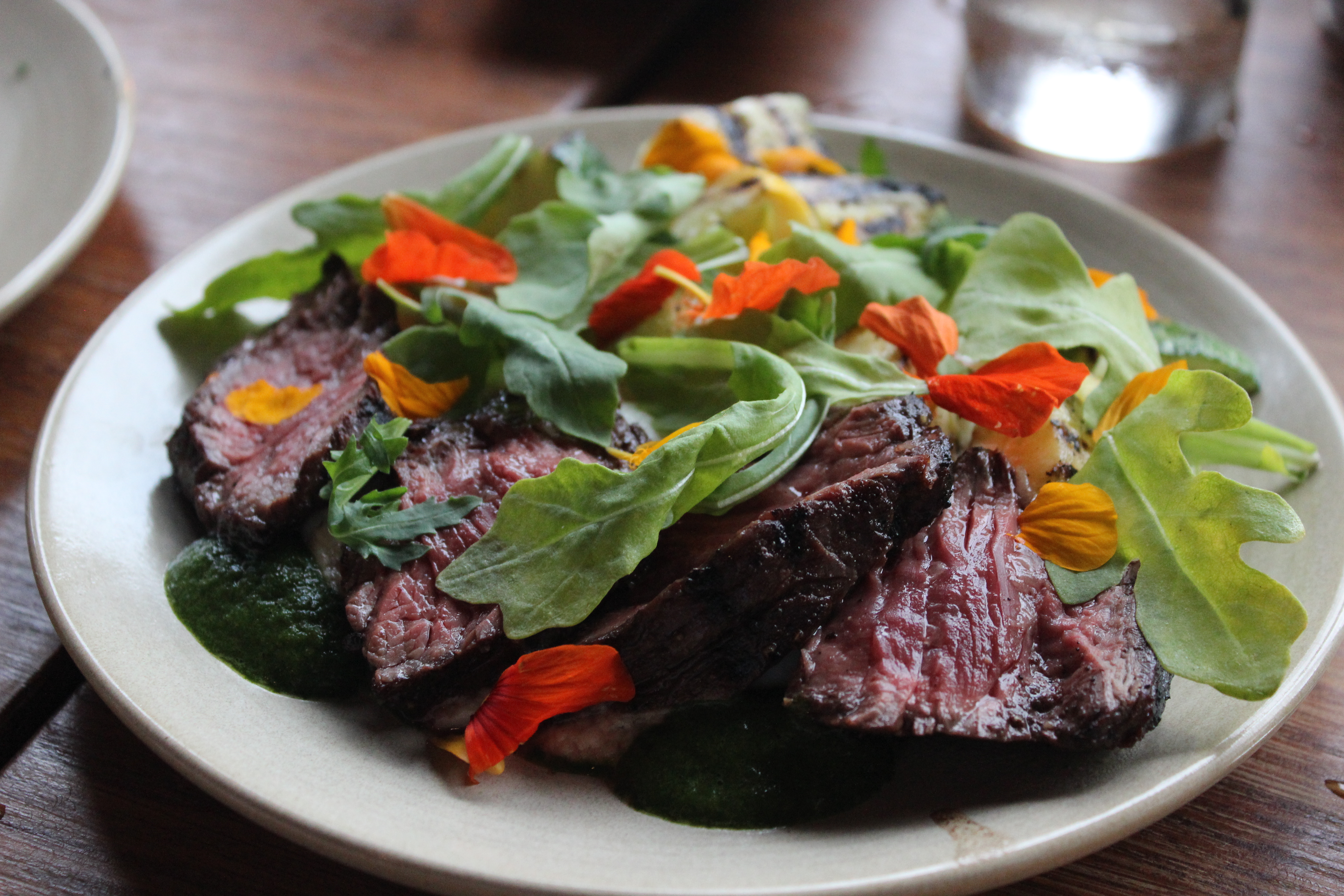 We were still hungry, so we also ordered the Hanger Steak (with potato puree, summer squash and arugula, $15).  It was pretty on the plate, but could have used a bit more flavor.