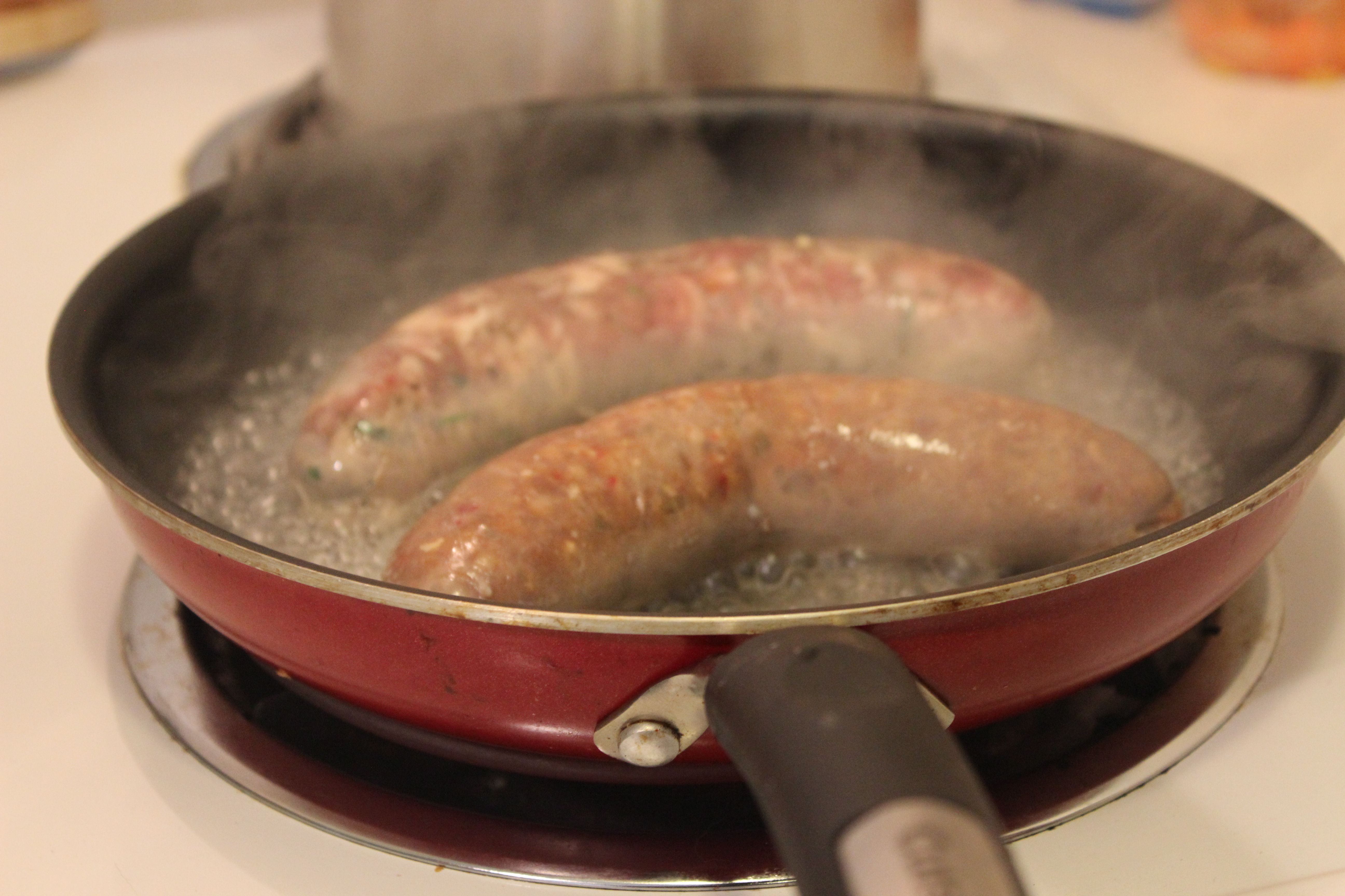 Peter put the sausage in a skillet with a little water to cook it through.  When the water evaporated, he let the sausage brown and checked the doneness with a finger.