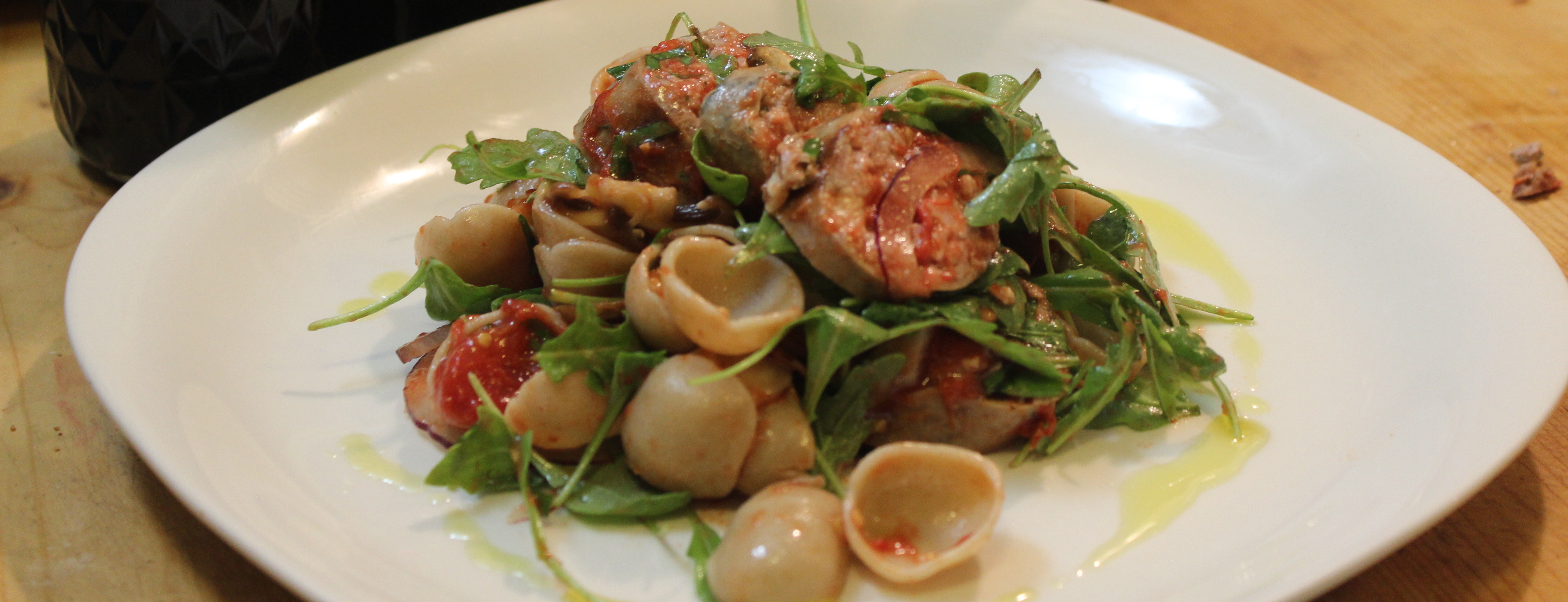 The Great Garlic & Gouda Sausage in a Baia pasta salad with red onion, crimini mushrooms and arugula