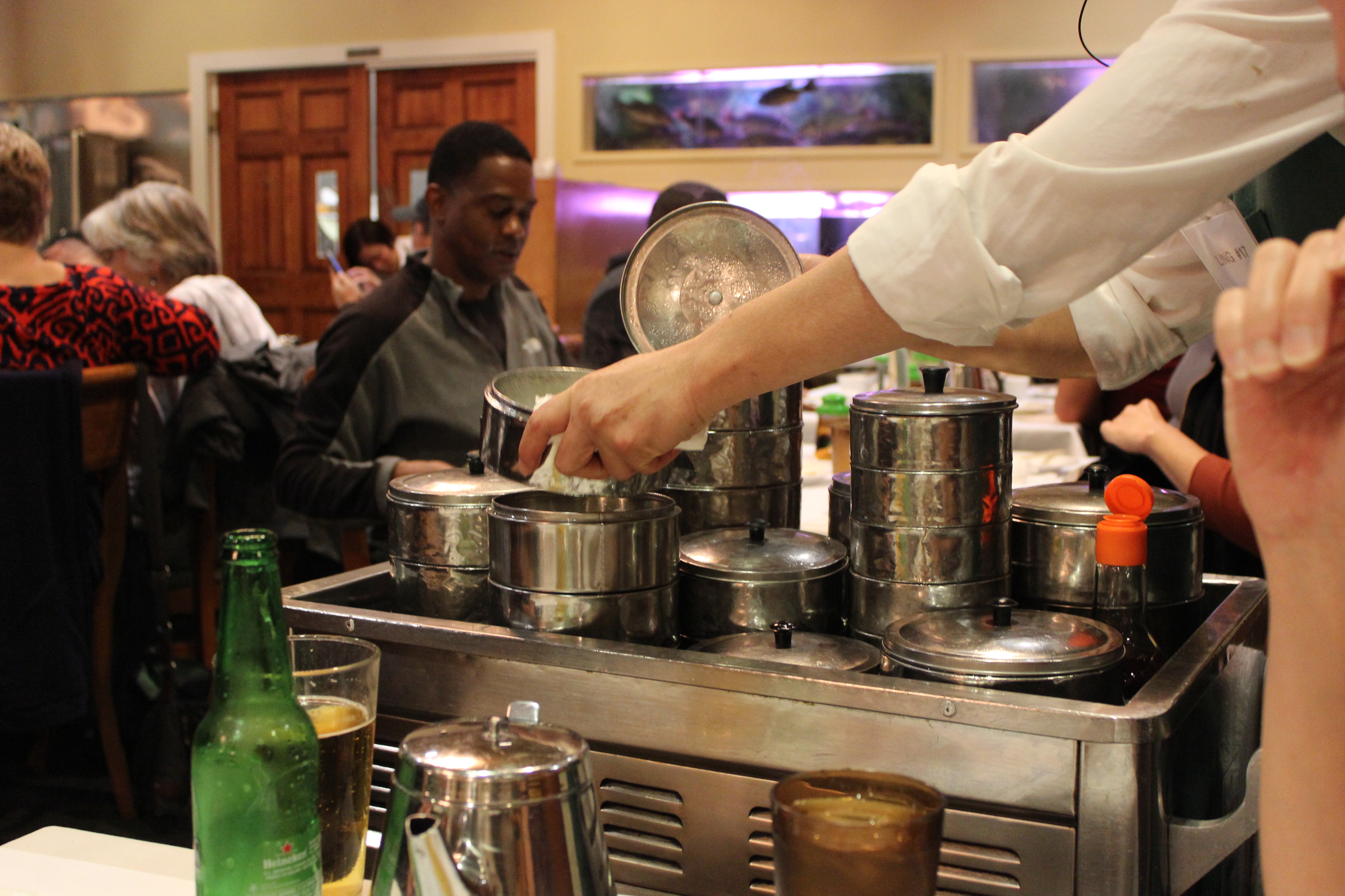 There were lots of traditional dumplings and not-so-traditional dishes to try.  My favorites were the chive and shrimp dumpling, the xiao lung bao (Shanghai soup dumpling) and the Chinese Broccoli.