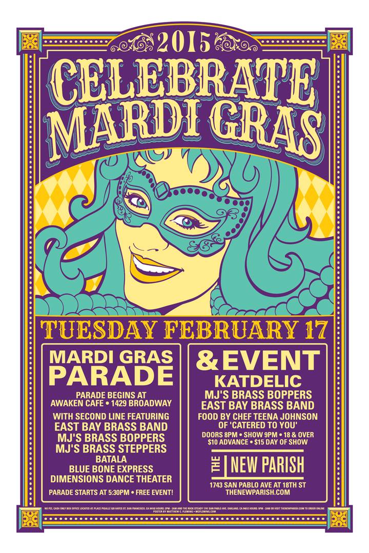 the new parish mardi grasThe New Parish is hosting a Mardi Gras Parade that starts at Awaken Cafe (1429 Broadway).  Entertainment includes East Bay Brass Band, MJ’s Brass Boppers, Batala, MJ’s Brass Steppers, Blue Bone Express, Dimensions Dance Theater and food will be provided by Chef Teena Johnson of ‘Catered To You.’