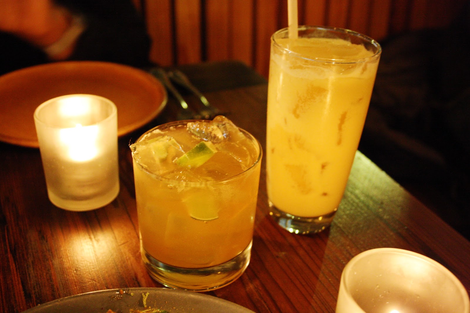 We began with cocktails. Christina ordered the Lorax (left – cachaca, lime, prickly pear spirit, rocks, $13, a tree is planted by the National Forest Foundation for every cocktail purchased), which she described as a caipirinha with a twist. I tried the Fault & Fractured (right – bourbon, tangerine, cream, cardamom, rocks, $13, supporting The Food and Water Watch Campaign to ban fracking) which was colorful and delicious and reminded me of an adult creamsicle
